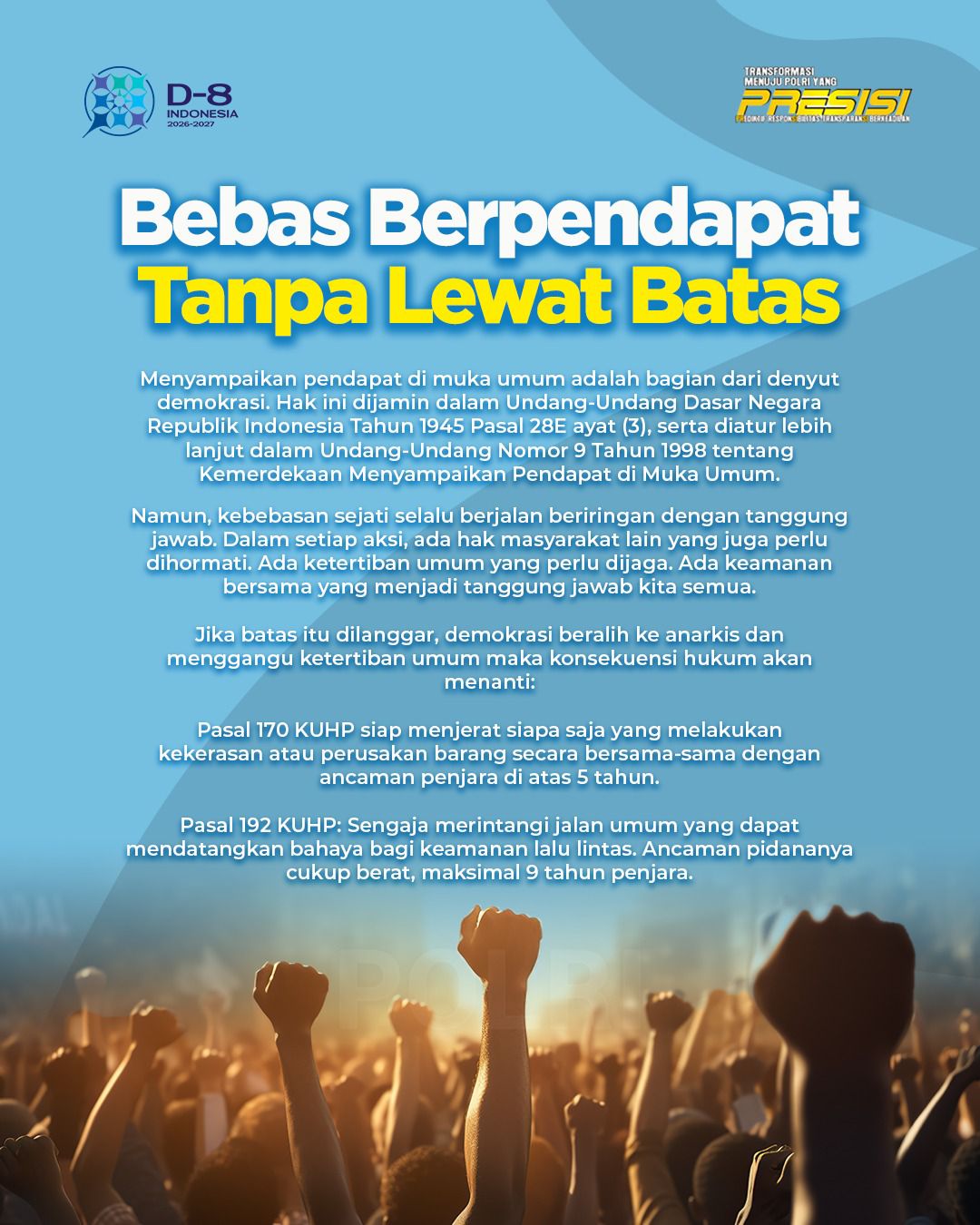 Meski demikian, kebebasan tersebut bukan berarti dapat dilakukan tanpa batas. Setiap aksi penyampaian pendapat tetap harus memperhatikan aturan yang berlaku, menjaga ketertiban umum, serta menghormati hak-hak orang lain.